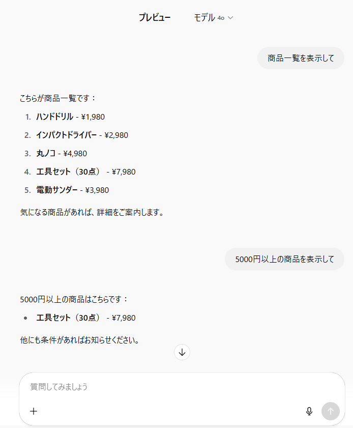 たとえば、ユーザーが「商品一覧を見せて」や「○○の価格は?」と入力すると、GPTがAPIを自動で呼び出してデータを取得・表示してくれますので、APIの存在を意識せずに使える自然なUXが実現できるのが大きな特徴です。