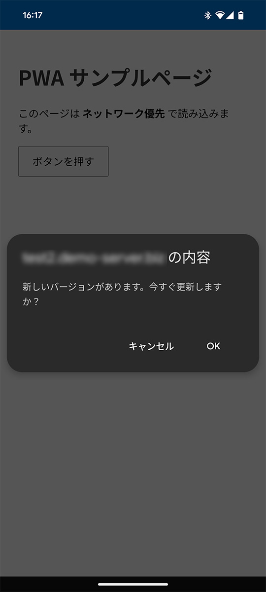 のキャッシュ名や内容を変更して再アップロードします。アプリ側でページを再読み込みすると、新しいバージョンが検知され、確認ダイアログが表示されます。「今すぐ更新」を選択すると、新しいコンテンツが適用されます。今回の例はあくまでもPWAの動作確認用のサンプルとしてwindow.confirm