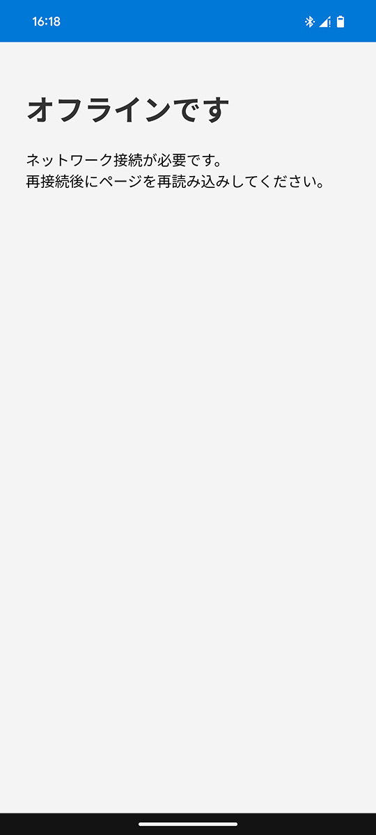 スマホやPCを機内モードにする、またはネットワーク接続を切断した状態でPWAを起動します。ネットワークが利用できない場合でも、Service Workerが事前にキャッシュしたoffline.html
